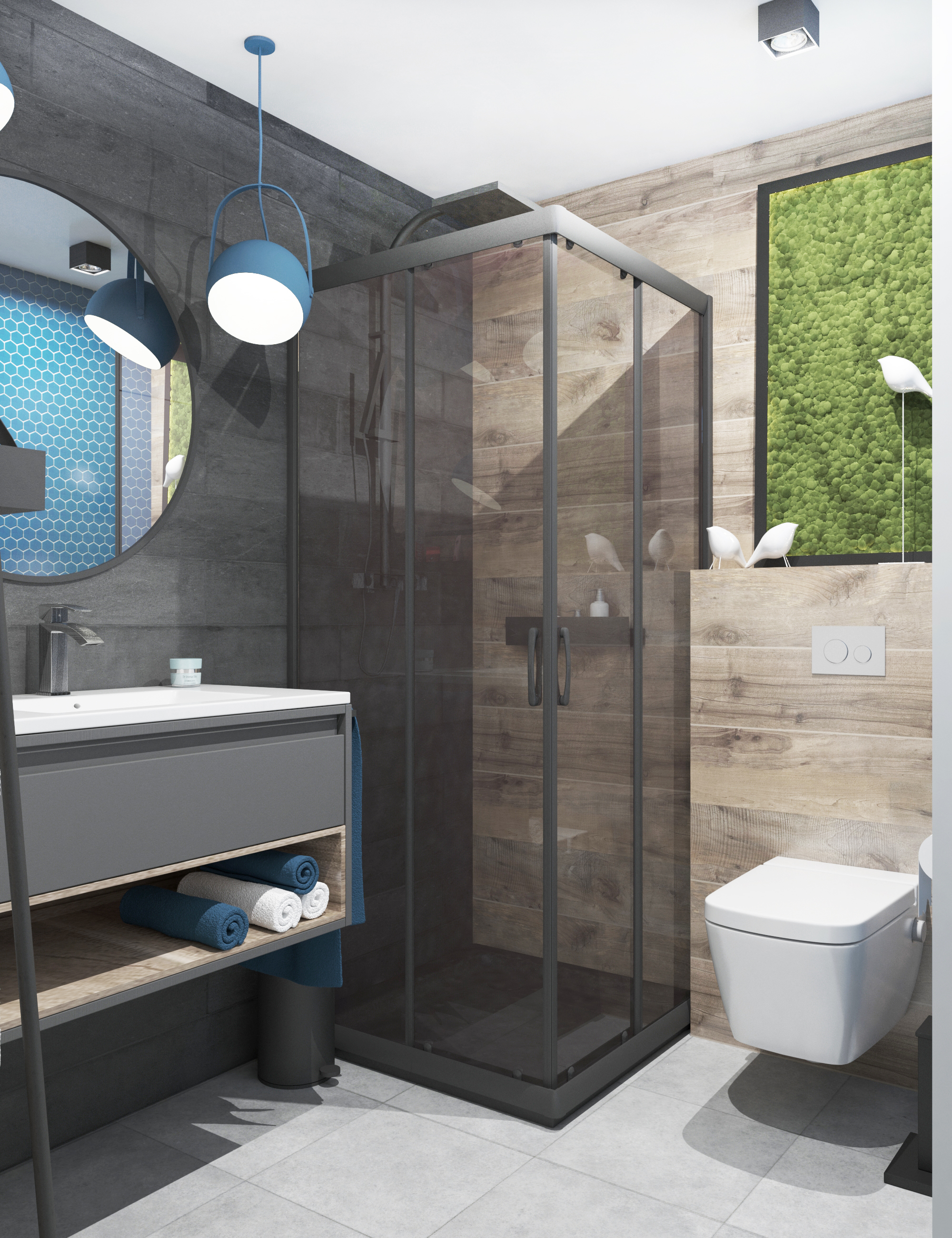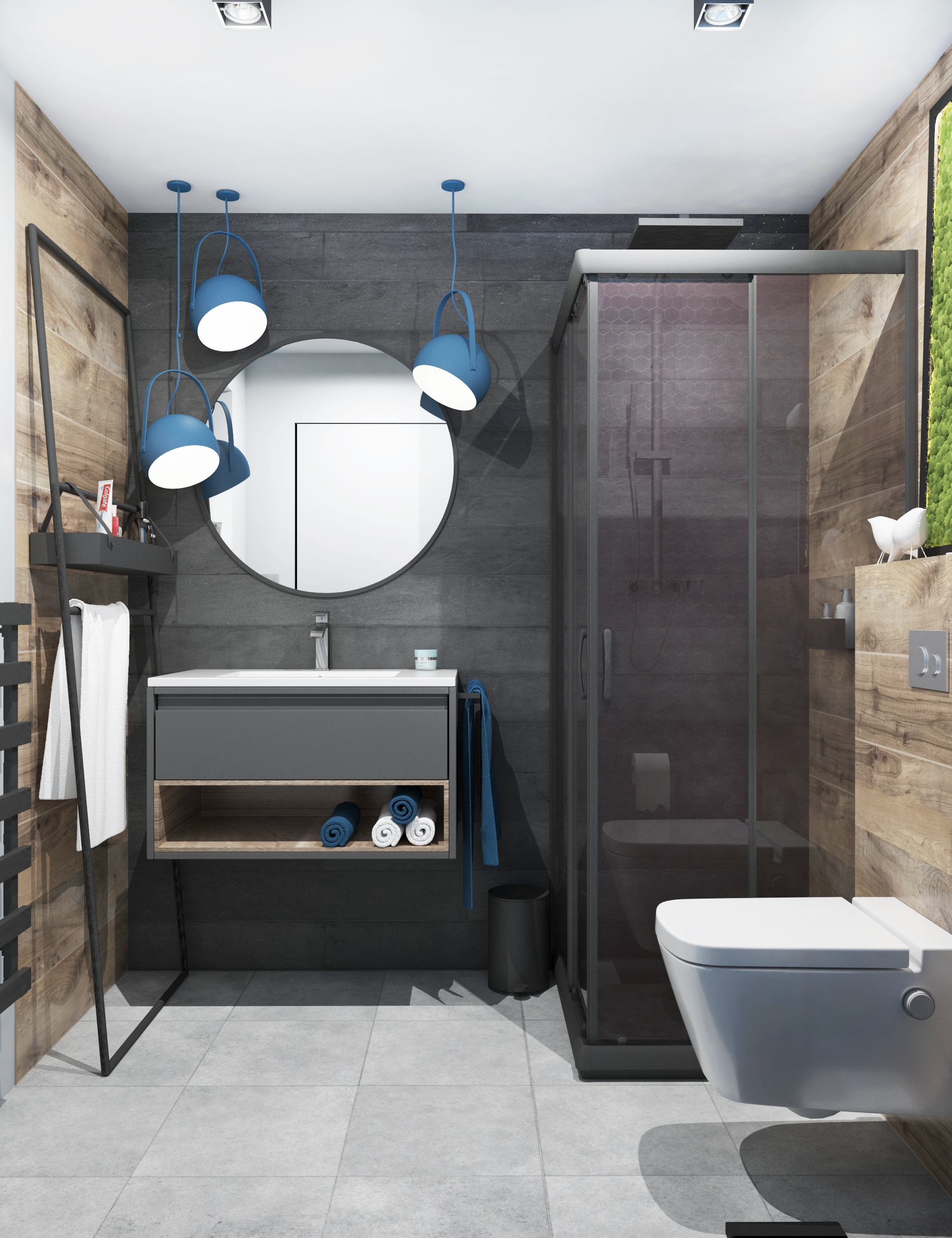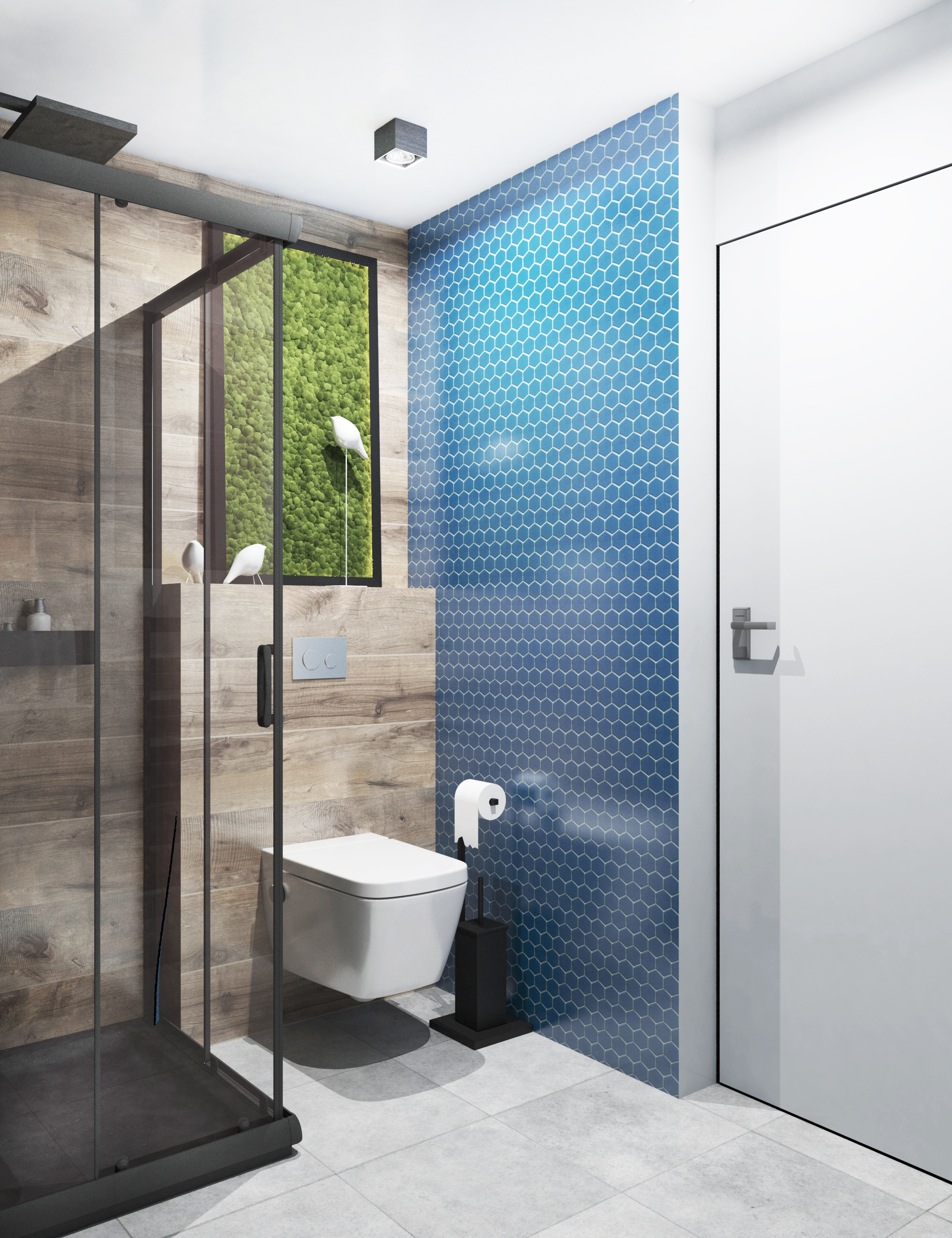 ENG – Mała łazienka z niebieskim akcentem w postaci heksagonalnych płytek oraz oświetlenia.