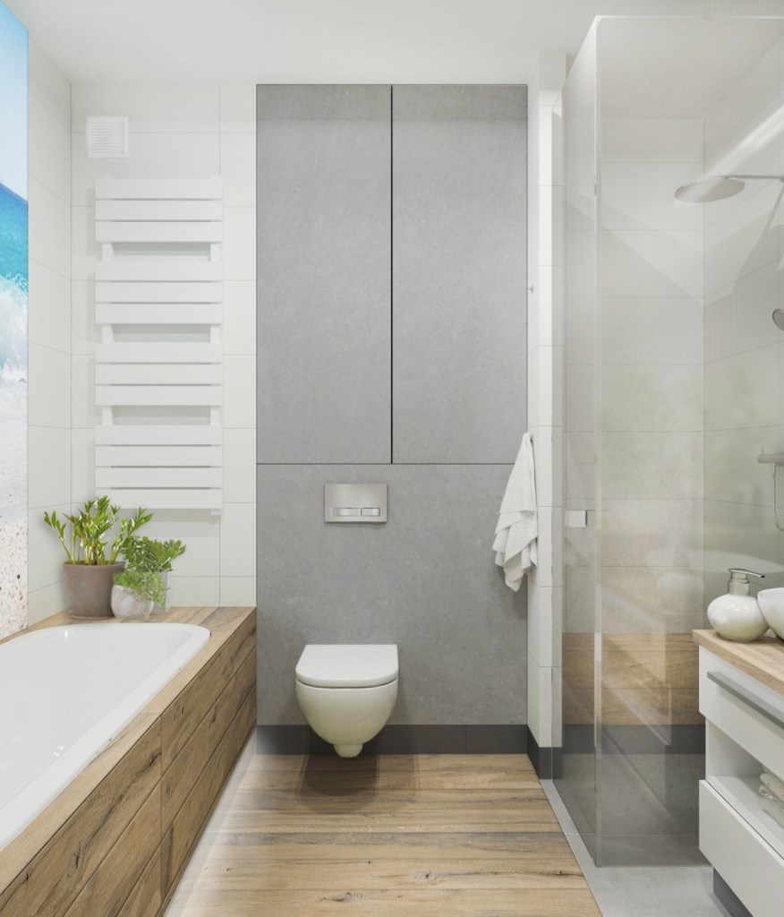 ENG – The owners of this property wanted their interior to remind them of the areas where they love to spend their free time, i.e. the areas of the Mediterranean Sea. Above all, they cared about simplicity and functionality. The interior is dominated by white and wood, and everything has been softened by subtle, carefully selected accessories. A delicate accent is the built-in furniture in gray colors next to the toilet.