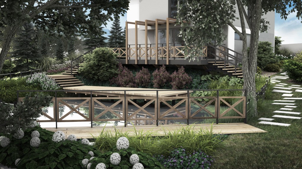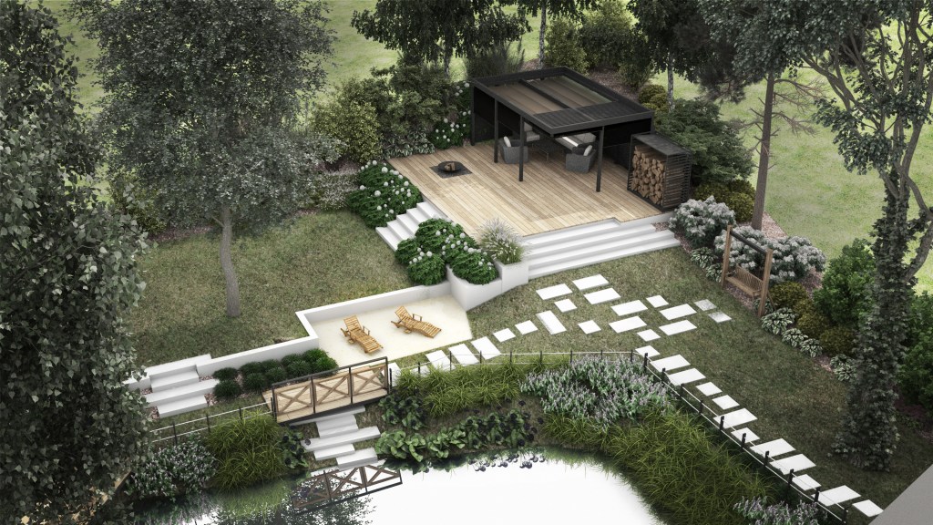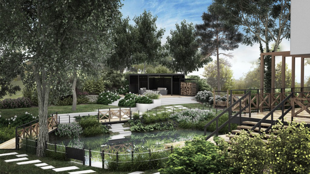 PL – Ogród prywatny w centrum Krakowa z prywatnym stawem.