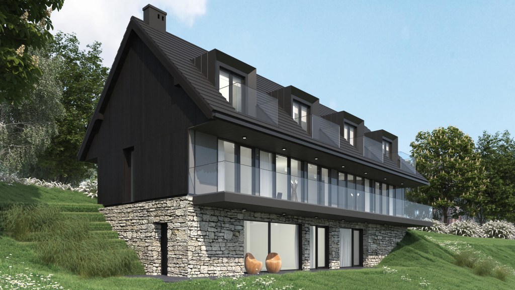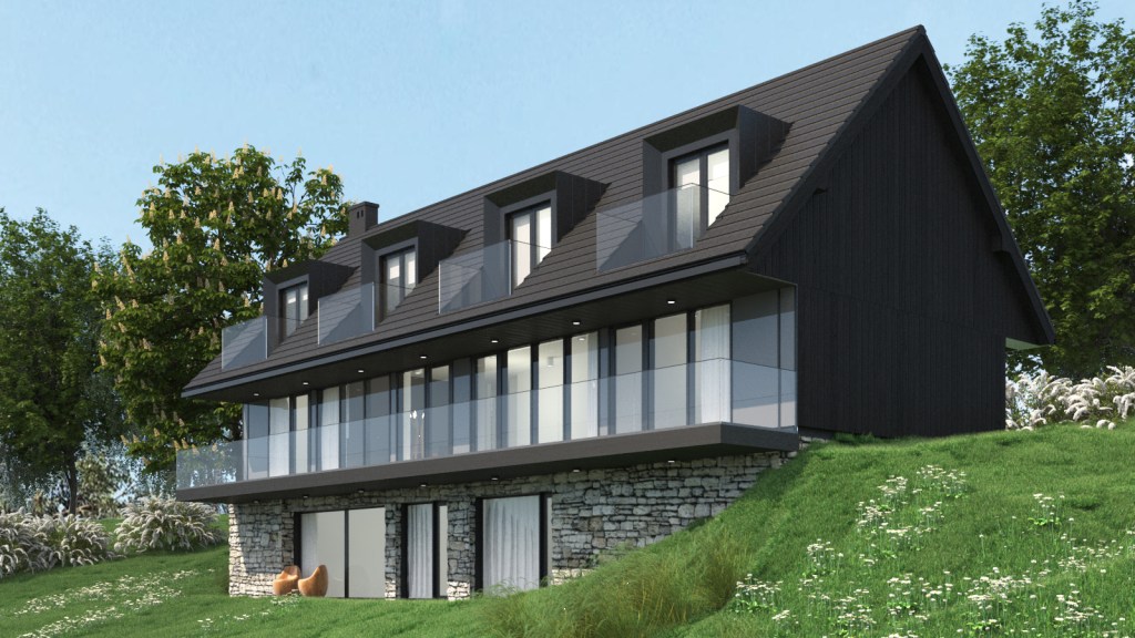 ENG – Visualizations of the facade of a private house in two versions. Using Shou Sugi Ban fired boards and natural stone on the facade.