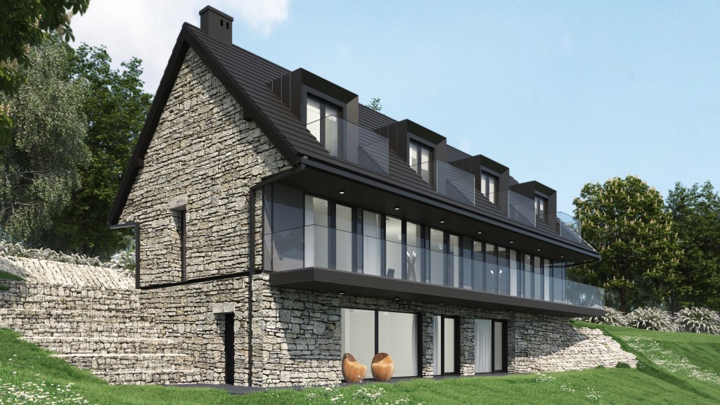 PL – Wizualizacje elewacji domu prywatnego w dwóch odsłonach. Z wykorzystaniem deski opalanej Shou Sugi Ban oraz kamienia naturalnego na elewacji