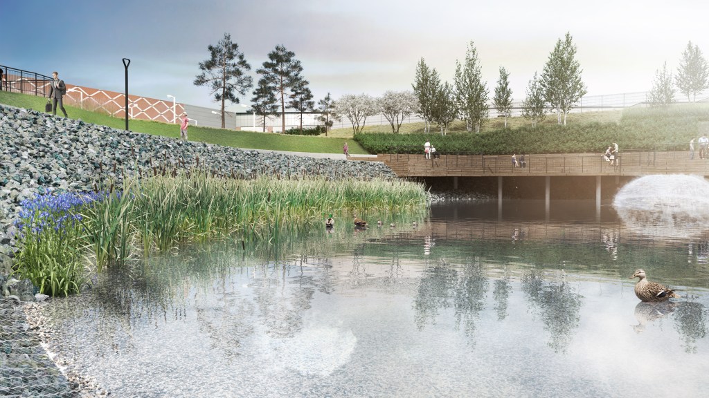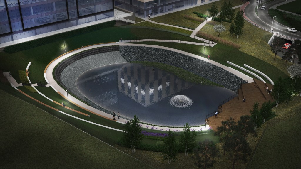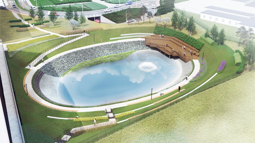 PL – Wizualizacje nowej przestrzeni rekreacyjnej w sąsiedztwie budynków biurowych w Krakowie.