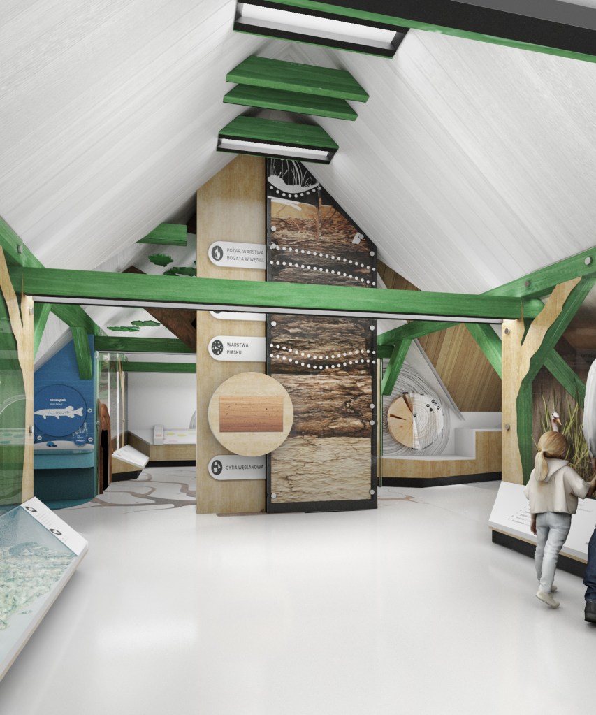 ENG – The project of arranging the ground floor of the headquarters of one of the Landscape Parks allowed us to delve into the Lubawska dialect and learn what the „masterka” is for digging Peat. The entire facility will allow you to get to know the region from the ethnographic and natural side. The natural and archaeological part of the project for the arrangement of the headquarters of one of the Landscape Parks will surprise visitors with the preservation of the original color of the woodwork, but in contrast to the bright colors. Much of the content is devoted to the heart of this region, the river. You can learn how peat bogs are formed and how important their importance is.