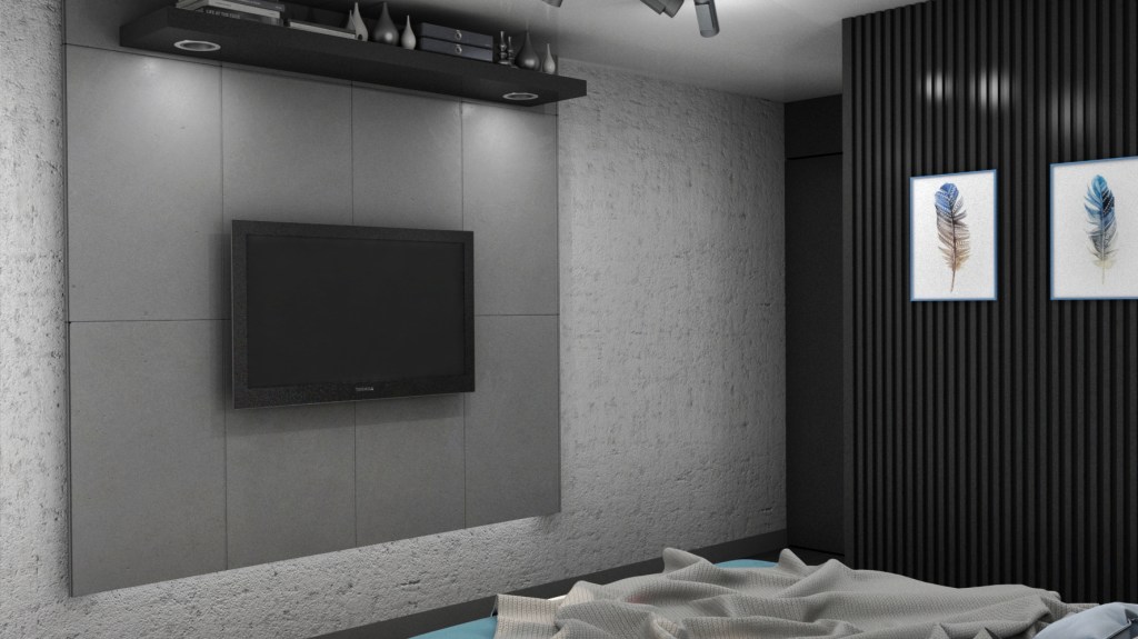 ENG – The basic assumption of the modern style is the love of simplicity. Instead of intricate decor and ornaments, the design is dominated by straight lines. We carefully select the finishing materials and colors – there cannot be many of them, and the entire decor should create a subdued, transparent whole. The basic assumption of the modern style is the love of simplicity. Instead of intricate decor and ornaments, the design is dominated by straight lines. This bedroom is dominated by gray and black, enlivened by turquoise accents.